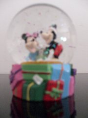 I personaggi forse più conosciuti di Walt Disney, che si scambiano teneramente un regalo di Natale, sono racchiusi in una piccola sfera con la neve e con i brillantini ad animare la tempesta che si scatena dopo che la si agita.
