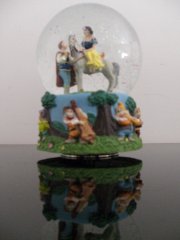 Febbraio è il mese di San Valentino, la festa degli innamorati e, quindi, come non parlare di una coppia famosa delle fiabe e della sfera ad essi dedicata. Stiamo parlando dei personaggi della classica fiaba dei fratelli Grimm che sono stati racchiusi in una sfera dalla Disney. L'ampolla è di dimensioni ragguardevoli e al suo interno ci sono Biancaneve e il Principe che gentilmente le ha ceduto il suo cavallo bianco. Ad animare la tempesta di neve, quando si agita l'ampolla, ci pensano dei fitti brillantini che, seppur meno armonici della più classica neve, danno un effetto molto gradevole da guardare. Insieme ai due fidanzatini, ci sono anche i nani, ma sono finemente intarsiati sulla base in resina di bella fattura. A completare il tutto un bellismo carillon che esegue la melodia "Talk to the animals" del cartone animato e un movimento meccanico che consente ala sfera di muoversi su sé stessa.