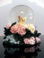 Una piccola sfera, misura solo sei cm di diametro, ma davvero ben fatta! Il soggetto all'interno è una fatina del bosco dalle ali gialle, contornata da una densa nube di brillantini che animano la snowstorm visibile nel video qui sotto. La base del globo è in resina ed è ben scolpita. Il prezzo non è elevato se si considera la lavorazione floreale a rilievo della base.