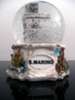 Per farci perdonare del non aggiornamento del sito per più di una settimana, oggi mostriamo una bella sfera piena di neve proveniente dall'estero precisamente dalla Città di San Marino. Forse in qualcuno di voi questa affermazione avrà suscitato un'ilarità più o meno consistente, ma la realtà burocratica è ben diversa da quella geografica. Comunque tornando alla nostra sfera, le sue misure sono medio piccole, circa dieci cm. La base in resina è ben lavorata e mostra alcuni monumenti della città. La miniatura all'interno rappresenta il Palazzo Pubblico anche detto Palazzo del Governo, sede dei principali organi amministrativi di questa piccola repubblica e luogo ove si svolgono diverse cerimonie ufficiali.