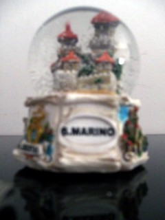 Una sfera di quelle piccole ma con tanta neve bianca! Trovata a San Marino, questa sfera contiene una vista della città. Agitandola si scatena una bella tempesta composta da neve artificiale di qualità che scende prima rapidamente per poi rallentare quasi come accade in una vera tormenta di neve.