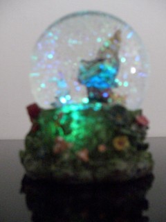 Certo ormai lo avrete capito, ma vi do un altro indizio: è considerato uno dei guardiani dei tesori della natura. Bravi! Avete indovinato: il soggetto rappresentato all'interno di questa sfera è uno Gnomo! Lui è a lavoro e lo affianca una simpatica lepre. La sfere, bella piena di brillantini, è poggiata su una base in resina finemente lavorata rilievo con motivi floreali e arborei. La base nasconde un semplice congegno elettronico per dare una luce multicolore cangiante nella sfera.