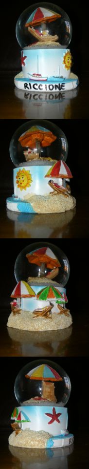 Questa sfera ci ricorda quella fantastica vacanza a Riccione, tra terme, discoteche, movida notturna, caldo asfissiante... Insomma una vacanza breve, purtroppo solo cinque giorni, ma bella intensa. Se penso che le vacanze di questo anno ancora non arrivano e potrebbero essere davvero deludenti, mi viene voglia di tornare nel passato. Comunque torniamo alla recensione di questa bolla con la neve che è di dimensioni medio piccole. La fattura della miniatura all'interno non è granché, ma rappresenta una signorina su una sedia sdraio sotto a un ombrellone a cui fa compagnia una stella marina e quindi è perfettamente a tema con la località di provenienza. Il materiale usato per la base e il la rappresentazione interna è molto plasticoso e la neve artificiale cade un po' troppo rapidamente, come potete vedere dal video qui sotto. Tutto sommato un bel ricordo, ma di certo non un buon affare. Giusta per iniziare una collezione, ma ben lontana dagli altri pezzi che son stati trovati a Riccione come, per esempio, il Veliero con carillon che, al momento, è il mio globo preferito.