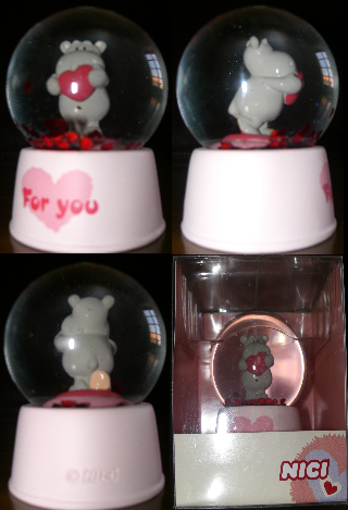 Questa piccola sfera potrebbe essere il regalo ideale per San Valentino, misura solo 6 cm in altezza e 4,5 di larghezza e diametro. Contiente un simpatico ippopotamino che regge un cuoricino come se volesse darlo alla propria amata e, infatti, sulla base in resina c'è scritto "for you" cioè "per te". Da notare come, al suo interno, non ci sia la classica neve, ma brillantini e cuoricini che cadono lentamente in modo da lasciare il tempo di dire qualcosa di dolce alla propria amata. Come avrete già capito, la sfera non è una di quelle economiche poiché è molto ben realizzata e, soprattutto, è stata fatta a mano. Fiero di tale opera in miniatura, il produttore ha impresso il suo marchio sulla base. Infine un commento sulla confezione trasparente, ideale per un regalo e per proteggere la sfera quando la propria ragazza la esporrà nella sua cameretta.
