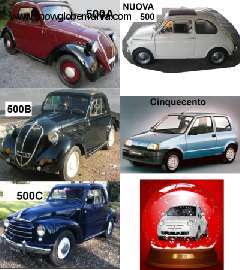 Prendo spunto da un fotomontaggio trovato in rete di una snowglobe contenente una fiat 500 ultimo modello, vera erede dei fantastici oggetti da collezione nati dalla matita e dalle capacità dell'ingegner Dante Giacosa: la 500 del 1936, chiamata amichevolmente Topolino prodotta in diversi tipi (A,B,C) e la Nuova 500 nata nel 1957 e prodotta fino al 1975. La Fiat 500 ormai è diventata un'auto storica, un cult che non può assolutamente mancare nel garage di un vero collezionista di automobili. I prezzi variano da circa 10000 euro a oltre 20000 per i modelli "Topolino" in perfette condizioni, mentre ben più economiche sono le versioni della "nuova 500" che si attestano ben al di sotto dei 10000 euro persino se tenute da amatore. Prezzi da saldo per la Cinquecento anni novanta, meno di 500 euro, ma per il momento non è certamente un' auto da collezione nonostante la simpatia in comune con le "nonnette". La "500" attuale, visibile nella sfera con la neve in basso a destra e ancora a listino, pur non essendo un'auto storica potrebbe completare la vostra collezione di Fiat 500 insieme alle versioni "giardiniera".
