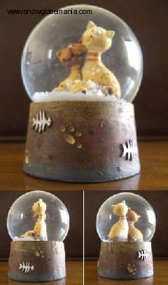 Finalmente è arrivato il caldo, la nostra pagina meteo prevede temperature oltre 30 gradi, quindi non resta che rinfrescarci con questa piccola sfera di vetro con la neve dedicata ai nostri amici gatti. La sfera misura appena 6,5 cm di diametro e, compresa la base, è alta 9cm. I tre gattini, due seduti e uno disteso, hanno dei musetti davvero simpatici. La simpatia della sfera è esaltata dalla lavorazione della base in resita decorata con lische di pesce, di cui notoriamente i gatti son ghiotti, impronte di zampe e graffi. Purtroppo la neve di questa sfera, come le altre della stessa serie, cade un po' troppo rapidamente così come si vede nel video allegato. Resta comunque un'ottima sfera per rallegrare una scrivania un po' monotona.