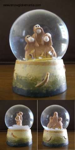 Questa piccola sfera, 6.5 cm per 9cm, rappresenta un motto giapponese solitamente illustrato con tre scimmie, la prima si copre gli occhi, la seconda si copre le orecchie e la terza la bocca. I loro nomi originari dovrebbero essere Mizaru, Kikazaru e Iwazaru che tradotti dall'idiona giapponese dovrebbero significare rispettivamente "non vedere il male", "non sentire il male" e "non parlare del male". Purtroppo manca "Shizaru" che ammonisce a "non compiere il male". In Italia spesso la scena è interpretata come un insegnamento omertoso: "non vedere", "non sentire" e "non parlare", mentre il significato originale è molto più profondo e corretto, una specie di insegnamento psicologico: non bisogna vedere il male per evitare di interiorizzarlo dato che alla fine farà stare male, inoltre non bisogna ascoltare il male per evitare di esserne lusingati e infine non parlare del male in modo da non nutrirlo ed evitare di lasciarlo diffondere. Un insegnamento all'armonia e pace interiore. Infine, la quarta scimma, non presente ha il significato di non fare il male cosa ovviamente non possibile se non si è mai parlato del male dato che non lo si è mai visto e sentito. Saggi questi giapponesi, ma torniamo alla sfera, molto piccola, appartente alla stessa serie di quella dei gatti e delle lumachine viste negli articoli precedenti e, quindi, con gli stessi pregi e difetti: scimmiette e base ben lavorate con banane a rilievo e neve che, purtroppo, cade troppo rapidamente.