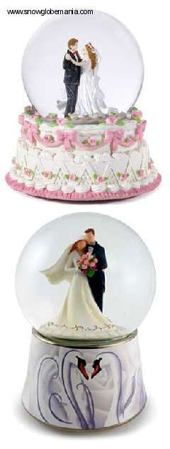 Rimediamo subito mostrandovi due fantastiche sfere dedicate a questo tema. La prima di ben 14 cm di diametro, venduta a circa 15 euro al pezzo, rappresenta una coppia giovane e bella in cima a una squisita torta nuziale. I due sposini si guardano perdutamente negli occhi mentre ballano insieme per la prima volta mentre un turbinio scintillante cade magicamente intorno a loro. La cupola di vetro poggia su una base in alabastrite.