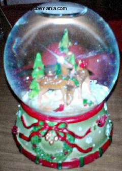 Osservate questa palla di vetro con la neve con due giovani cervi, ben fatti, che stazionano davanti a degli alberi di natale il tutto su una bella base decorata a rilievo, certo c'è una bolla d'aria, ma che importa se tutto il resto è originale e gradevole alla vista?